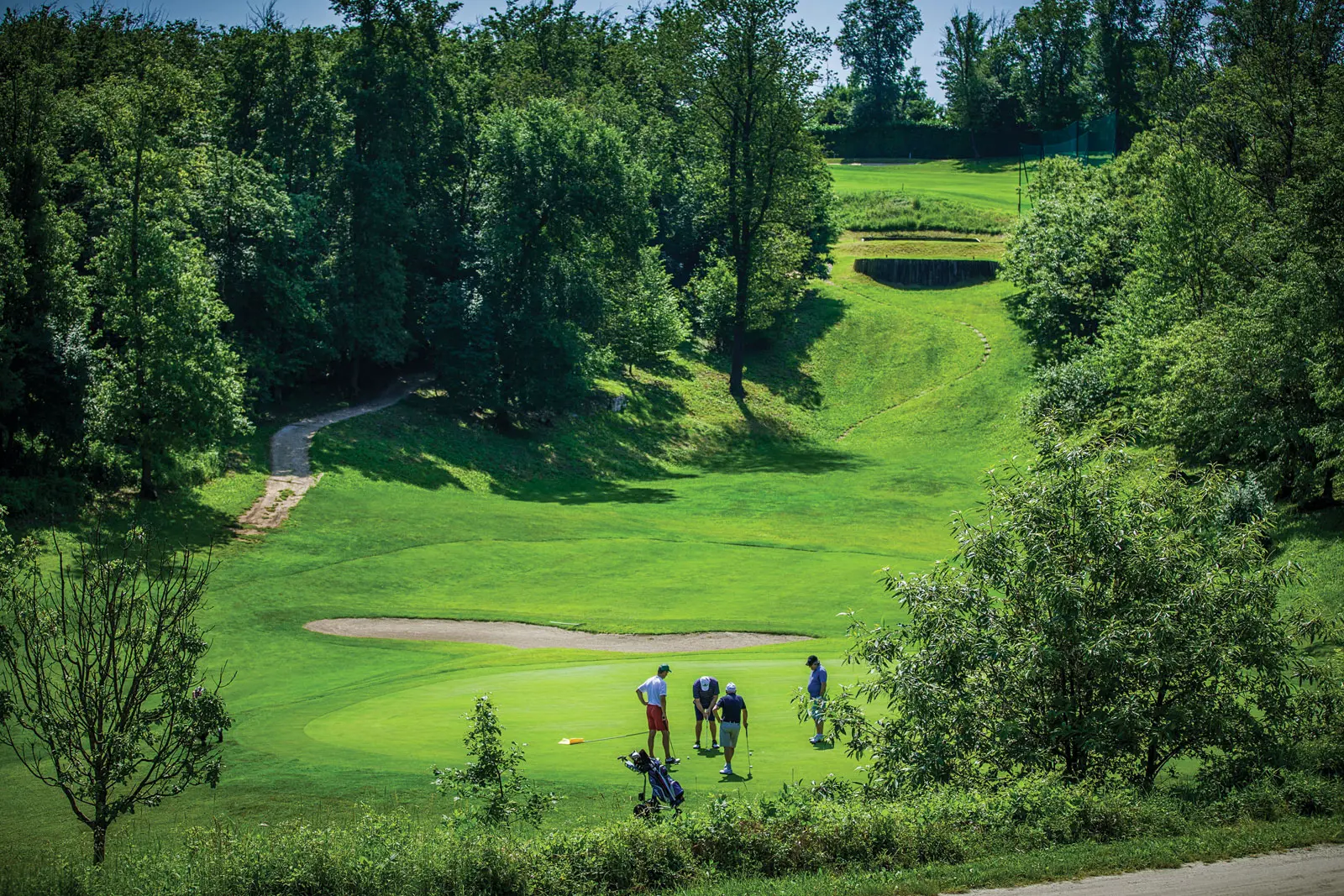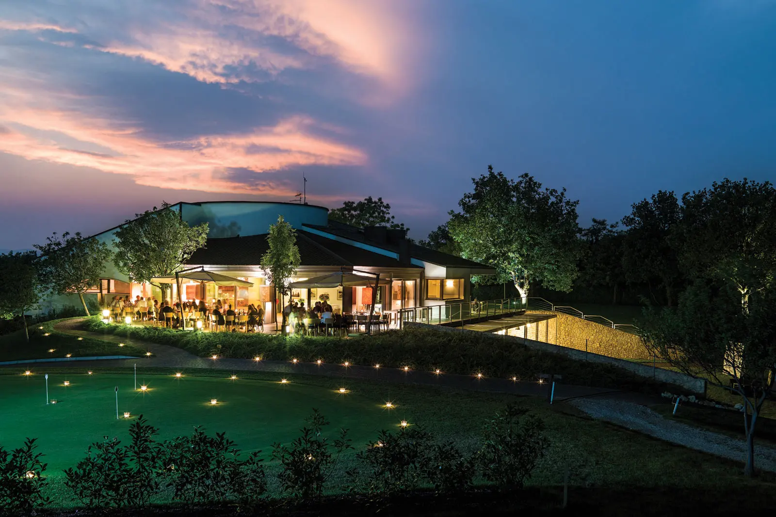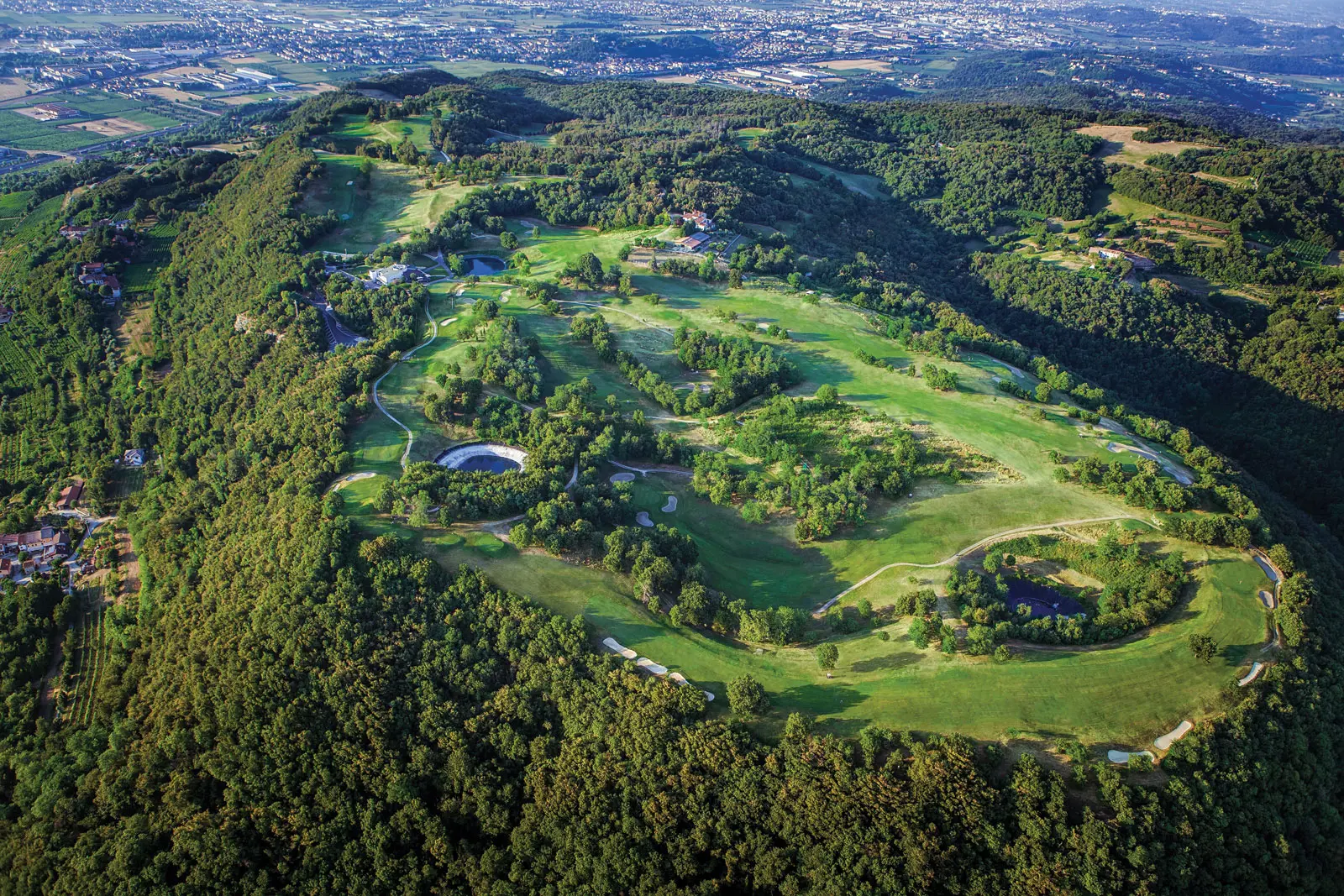 Die zweiten neun Bahnen verlaufen in einem dichten, erholsamen Wald aus Eichen, Hainbuchen und Kastanien. Das moderne Clubhaus bietet eine Außenterrasse und einen verglasten Wintergarten - einen schönen Platz, wo sich die Golfer treffen und stärken können. Die geräumigen und komfortablen Gemeinschaftsräume sind ideal, um das Panorama zu bewundern und angenehme Momente der Entspannung zu erleben. Das Clubhaus beherbergt eine Bar und ein ausgezeichnetes Restaurant, das im “Veronelli” verzeichnet ist und neben typischen lokalen Spezialitäten eine hervorragende Weinkarte anbietet. Entfernung zum Gardasee: ca. 40 min
